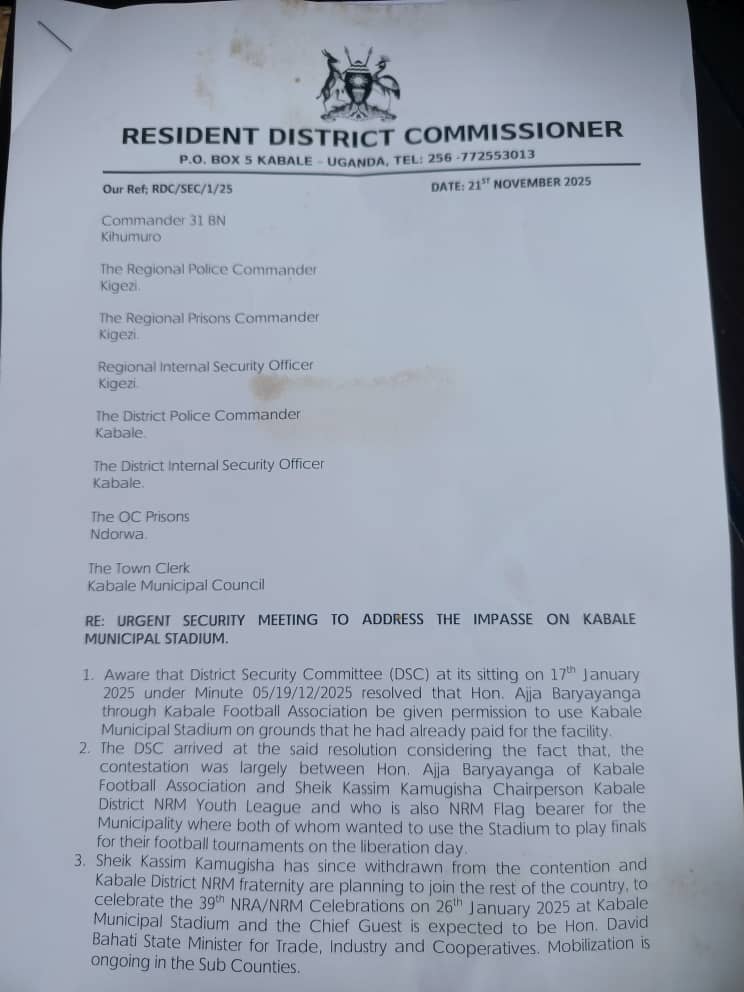 The Kabale District Security Committee (DSC) is set to convene again this week, on Wednesday, to revisit its earlier resolution regarding the ongoing dispute over the use of Kabale Municipal Stadium on January 26, 2025.