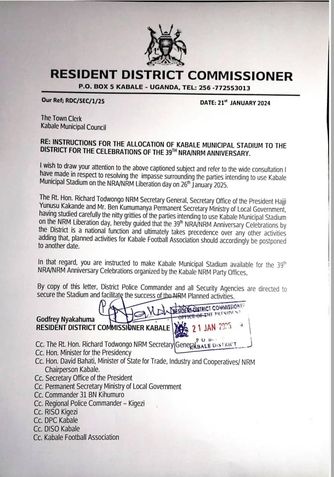 However, In the latest development, Nyakahuma has written to the Kabale Municipality Town Clerk, instructing him to open the stadium’s gates for the NRM Office on January 26.