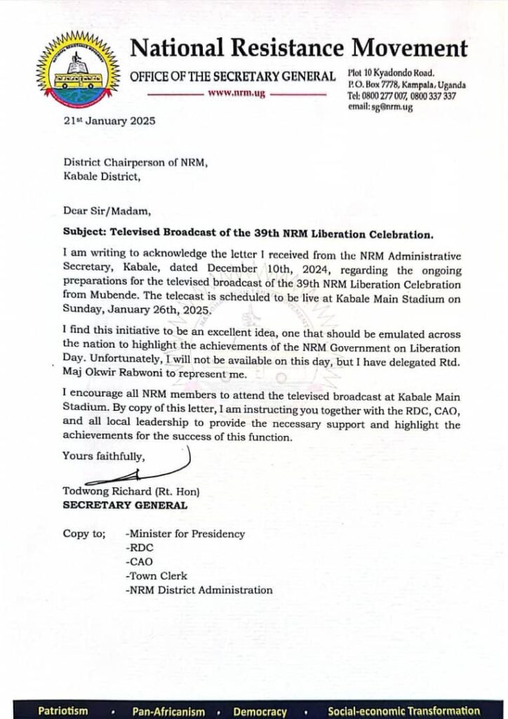This website has also obtained a copy of the letter written by the NRM Secretary General Richard Todwong asking all NRM supporters to convene at Kabale Municipal Stadium on January 26, 2025 for the NRM Liberation Day. Todwong has also thanked the District NRM Chairperson David Bahati thanking him and the office for the initiative to hold mini NRM Liberation Day Celebrations .